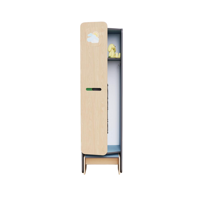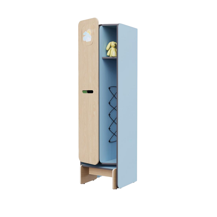 Детский шкаф-кабинка для хранения вещей и игрушек. Он разделён на две функциональные зоны: открытую - для верхней одежды, чтобы просушить её после прогулки в сырую погоду, и закрытую - для сменной одежды и обуви. Снизу шкафа идёт выдвижная скамейка. Предмет из коллекции мебели «НЕГА».