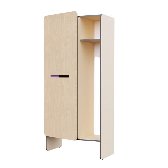Дизайн шкафа позволяет выбирать сторону открывания дверей, а сохранность личных вещей обеспечивает наличие замка с ключами. Шкаф снабжен надёжными крючками и полками для одежды.