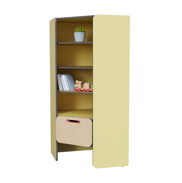 Угловой модуль для демонстрации детских работ. Оснащён глубокими полками для удобного размещения поделок воспитанников. Объединяет остальные модули из коллекции мебели «НЕГА» в единую композицию.