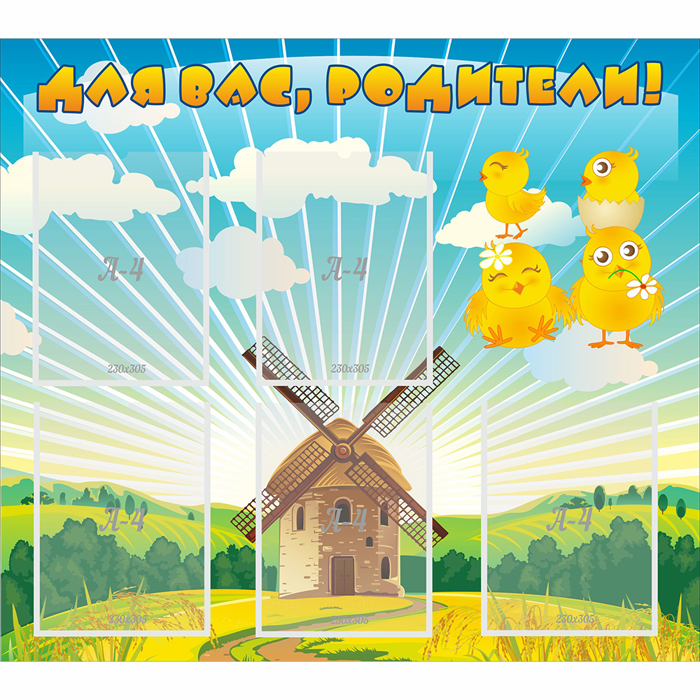 Информационный стенд для родителей с изображением милых цыплят, имеет пять специальных карманов размером в стандартный лист А4, это прекрасная возможность донести необходимую информацию для родителей. Стенд удобный и практичный, его легко установить в любом помещении и на любой поверхности. Стоит отметить, что он сделан из высококачественного материала, со специальным защитным покрытием, что позволяет сохранить яркость цвета и рисунки максимально долго. Стенд станет гармоничным дополнением в общую атмосферу детского сада, а яркие картинки привлекают внимание детей и очень им нравятся.