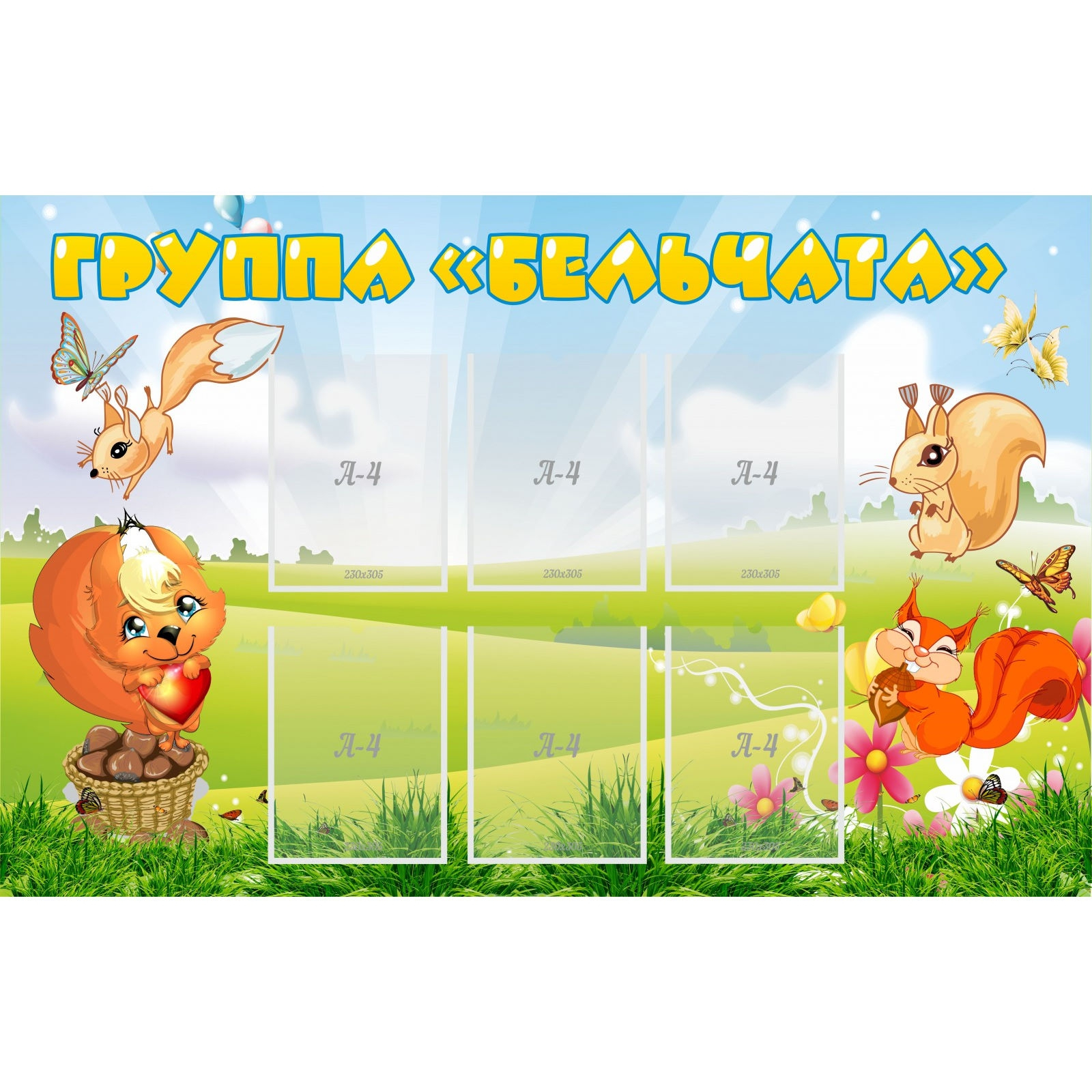 Приятное оформление детского сада - немаловажный момент для ребенка, ведь от этого зависит комфорт детей и атмосфера в группе. Выполненный в ярких радостных цветах стенд с изображением забавных бельчат порадует малышей и оставит тёплое впечатление у их родителей. На стенде можно разместить полезные материалы для родителей, такие как статьи о развитии детей, советы по воспитанию и образованию, информацию о родительских собраниях и других мероприятиях.
