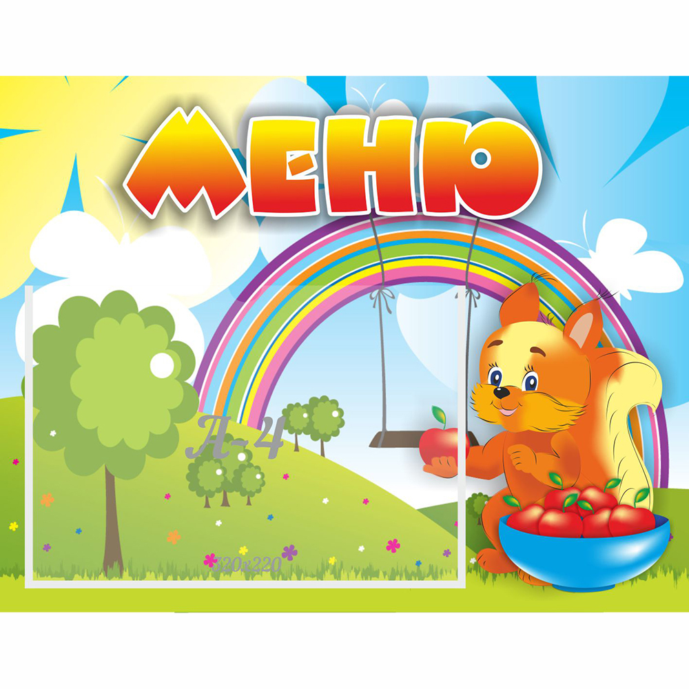 Пушистая белочка точно знает, чем сегодня будут баловать малышей повара. Белочка пришла не одна, она принесла детям много вкусных фруктов. Ребята смогут отыскать на картинке миску с красными яблоками, а еще их порадует яркая радуга, на которой висят качели. Такой дизайн привлечет внимание не только маленьких непосед, но и взрослых.