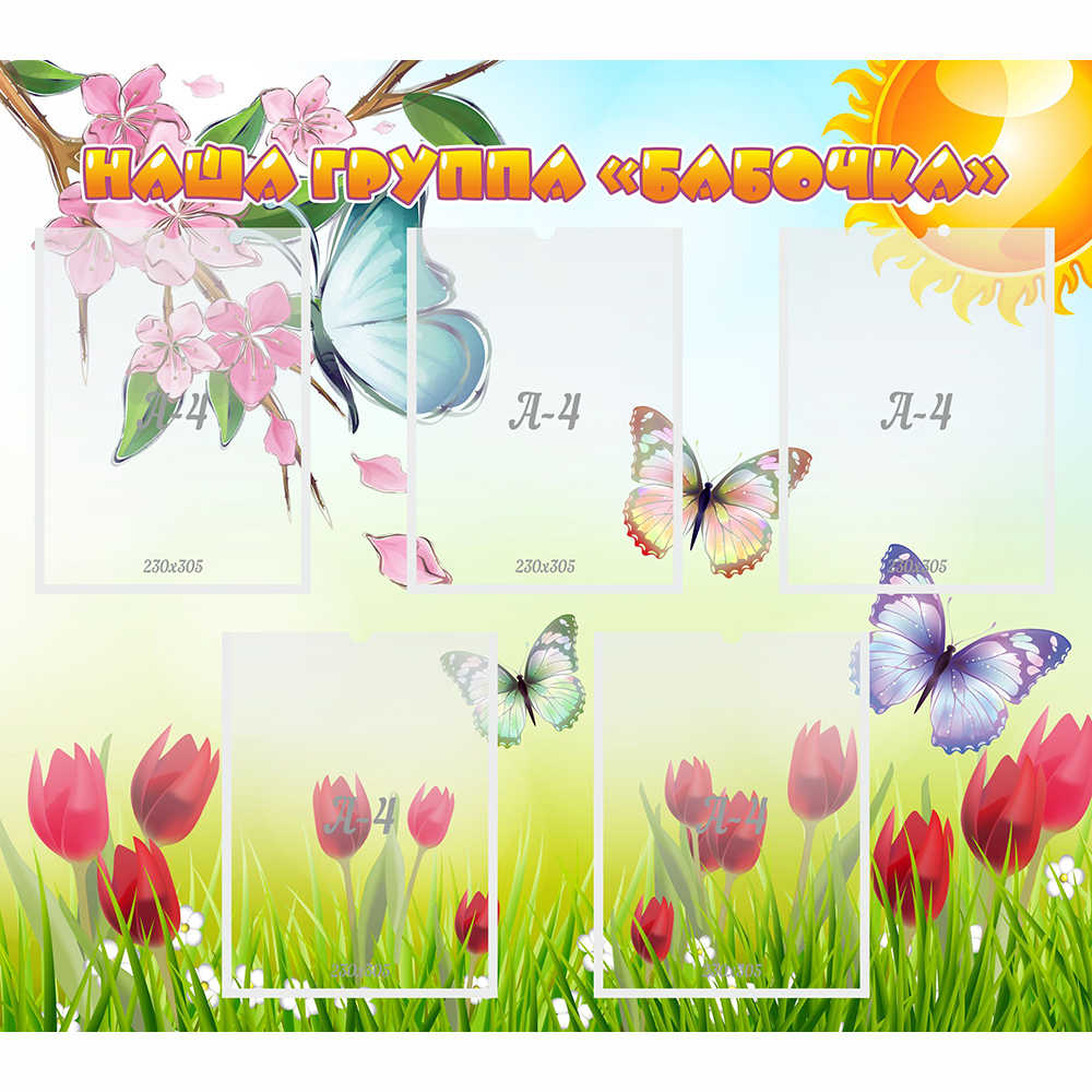 Оправдывая название стенда, порхание бабочек в цветущем саду привлекает внимание и детей и взрослых. В карманах можно поместить информацию о сетке занятий для детей, ежедневном меню, планируемых мероприятиях, контактных телефонах воспитателей. Благодаря этому стенду, родители всегда будут в курсе всех новостей из жизни садика и группы.