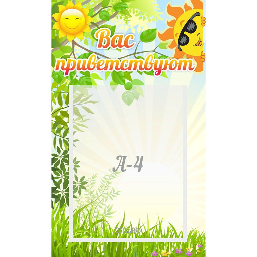 Яркие лучи восходящего солнца и веселые маленькие солнышки в окружении буйных трав и зеленой листвы приветствуют вас на входе в помещение группы. Такое оформление стенда обязательно привлечёт внимание детей. В удобный карман формата А4 можно поместить список группы малышей или любые другие информационные материалы.  Размещенная информация при необходимости легко обновляется.