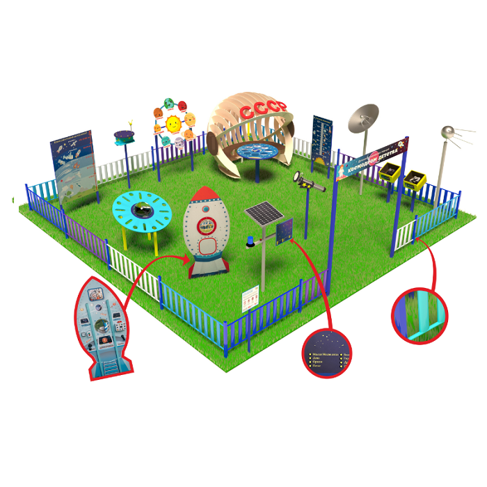 «Детская космическая станция» - это уличный комплекс, в состав которого входят красочные интерактивные стенды и макеты. С их помощью дети осваивают первые азы астрономии.