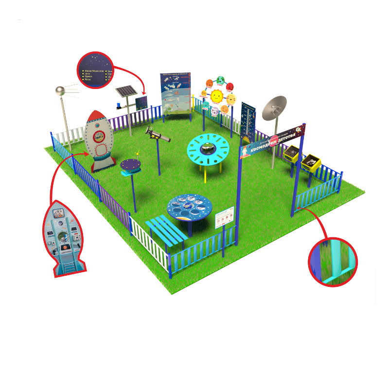 «Детская космическая станция» - это уличный комплекс, в состав которого входят красочные интерактивные стенды и макеты. С их помощью дети осваивают первые азы астрономии.