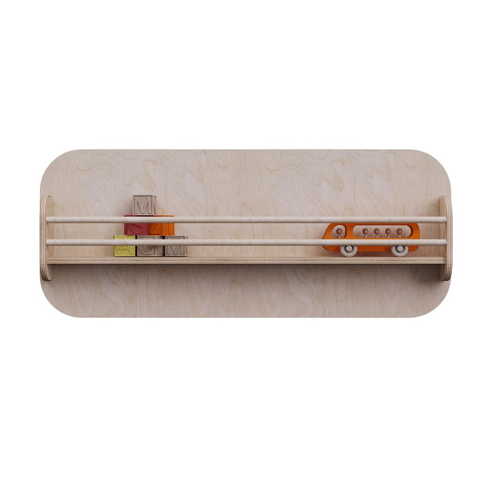 Полка для хранения дидактических, развивающих и рабочих материалов для демонстрации и обеспечения более простого и быстрого доступа. Горизонтальные перекладины препятствуют падению с полки элементов ее наполнения. Конструкция является не только практичным решением, но и стильным и экологичным украшением пространства.