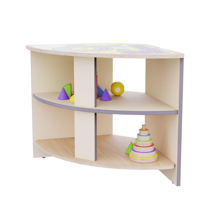 Угловое место для хранения идеально подходит для организации пространства в углах комнаты. Оно позволит эффективно использовать каждый сантиметр и обеспечит удобный доступ к материалам и игрушкам. На верхней поверхности цветная печать с картами дорог и настольной игрой, дети могут использовать ее для своих активностей.