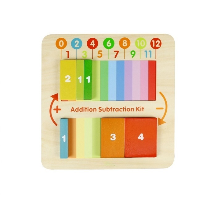 Основание панели выполнено из березовой фанеры, на лицевой части которой расположены разноцветные блоки, которые необходимо перемещать в верхнюю часть или убирать их, тем самым изучать основы сложения и вычитания. Результат отображатся на верхней панели. Эта отличная обучающая игрушка для обучение детей математике.