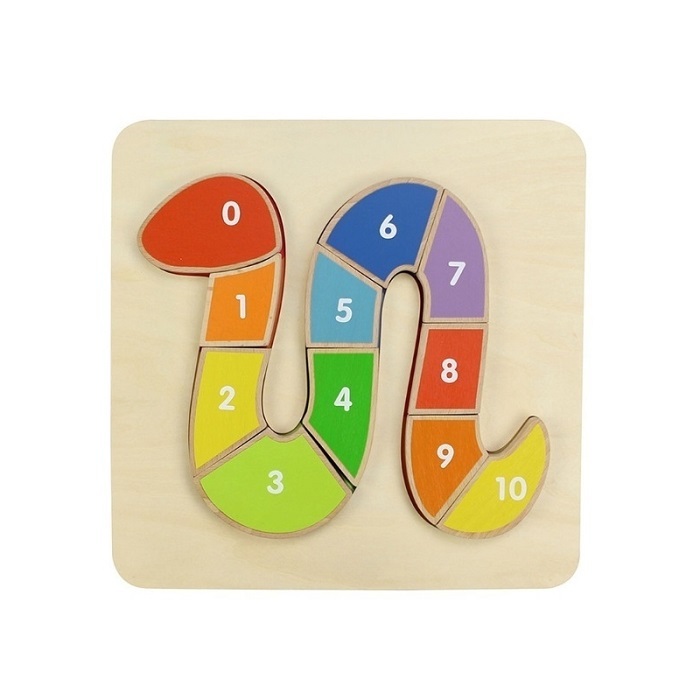 На лицевой стороне панели изображена головоломка в форме змеи, состоящая из из 10 разноцветных блоков, пронумерованных от 1 до 10. Ребенок в правильной последовательности должен расположить части головоломки, чтобы получить змею. Панель предназначена для обучения счету от 0 до 10 и знакомства с цветами.