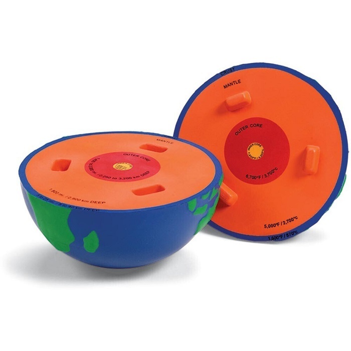 Шар поделен на два скрепляющихся между собой полушария, где можно увидеть внутреннее строение планеты: ее слои и ядро с указанием их наименований и температуры.