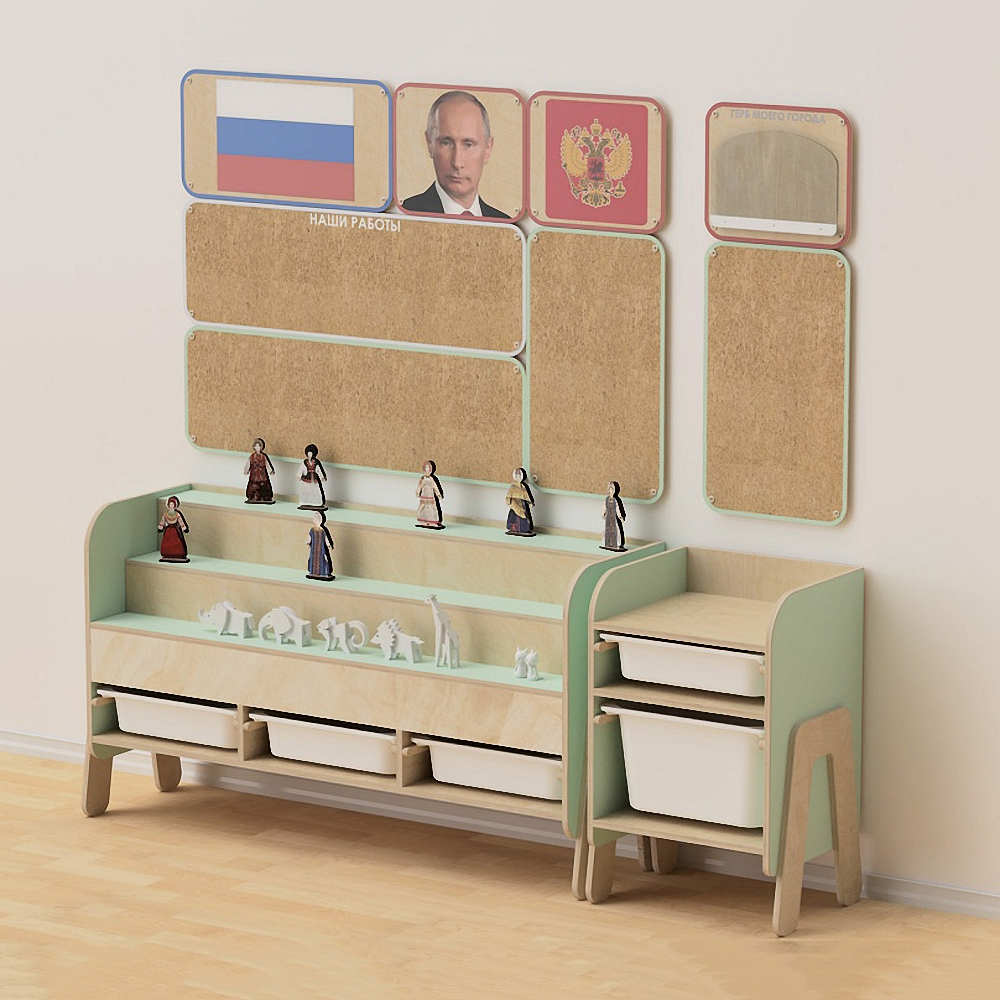 В комплекте собраны книги, раскраски и настольные игры для создания полноценного курса по патриотическому воспитанию. Удобные стеллажи с полками и ящиками содержат всё необходимое наполнение, чтобы проводить занятия с дошкольниками 3-6 лет.