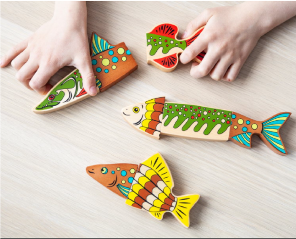 1. Разомкните рыбок на составные части и разложите вперемешку. Задача ребенка соединить части таким образом, чтобы рисунок на рыбках совпадал.