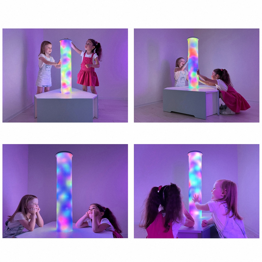 Световое оборудование для оснащения сенсорной комнаты. Колонна может быть не только украшением интерьера, но и вспомогательным инструментом при работе с детьми. Мягкие и плавные переливы света завораживают и расслабляют ребёнка, снимают эмоциональное напряжение, помогают забыть тревоги и волнения.